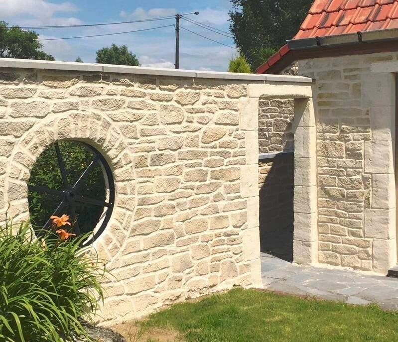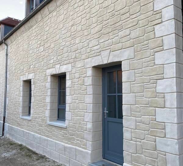 Posé à la main, travaillé dans la matière fraîche, il reproduit fidèlement le grain, les joints et les aspérités de la pierre naturelle.
